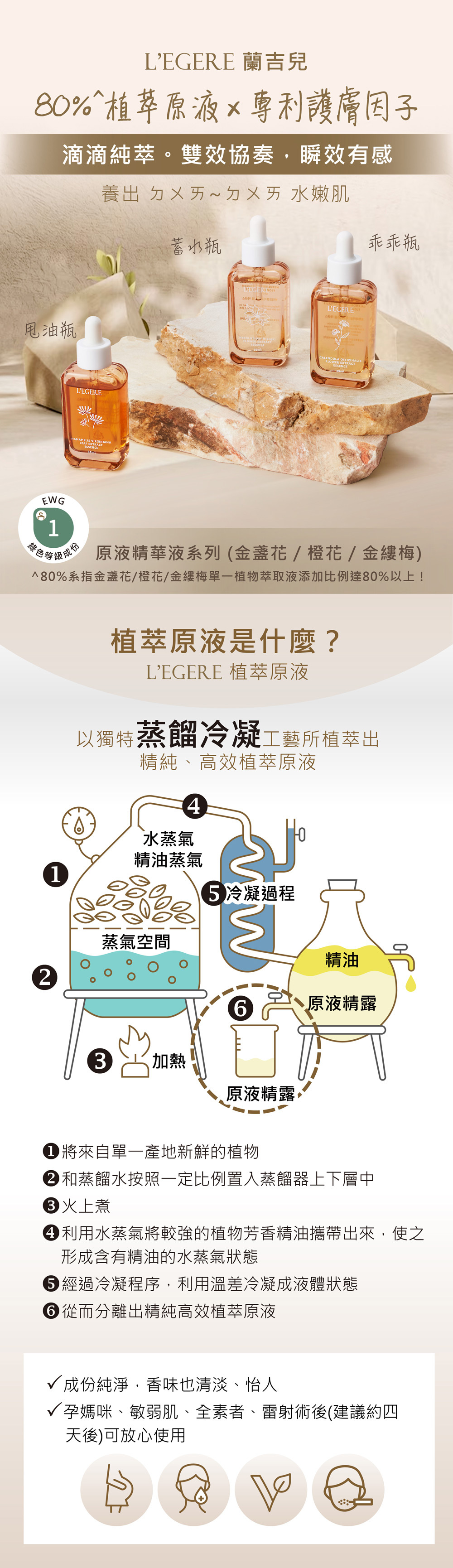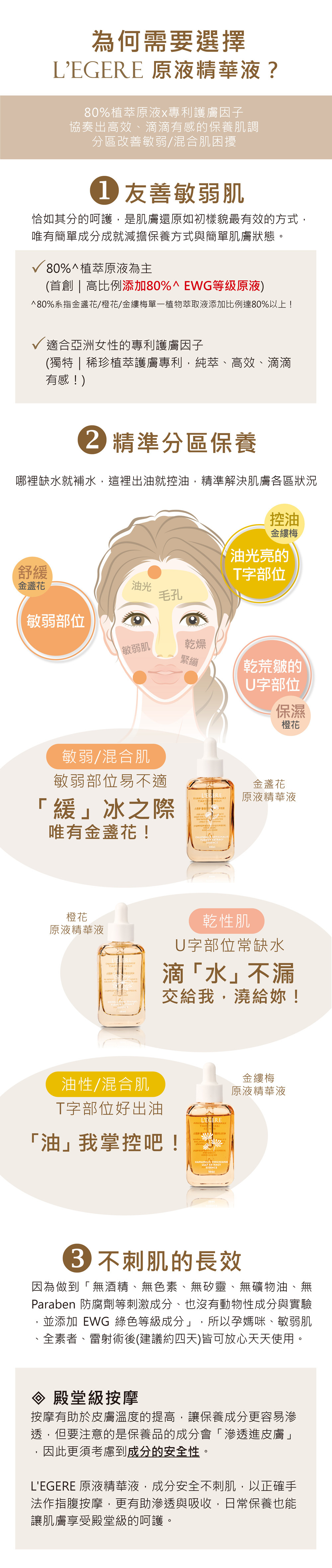 主商品:L'EGERE 原液精華液 (金盞花舒緩/金縷梅控油/橙花保濕)