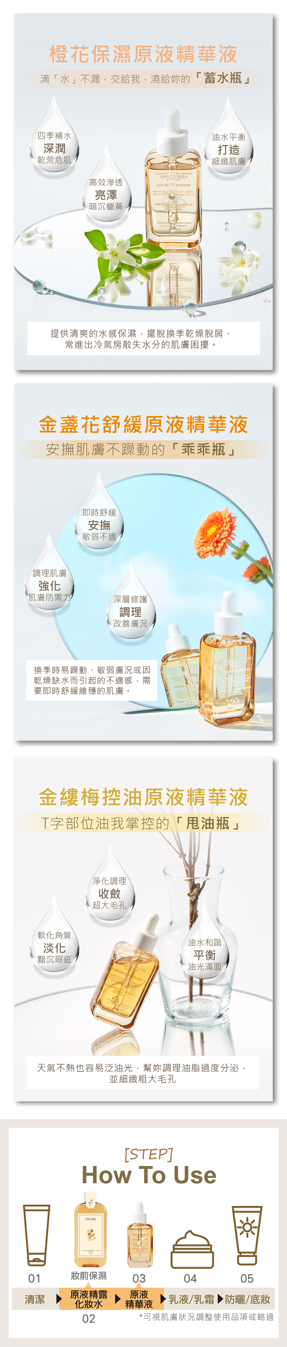 使用方法:每天早/晚潔顏後,先上化妝水及精華液之後使用。搭配「金盞花舒緩原液精華液」,可帶來最佳舒緩安撫效果,打造健康穩定肌。